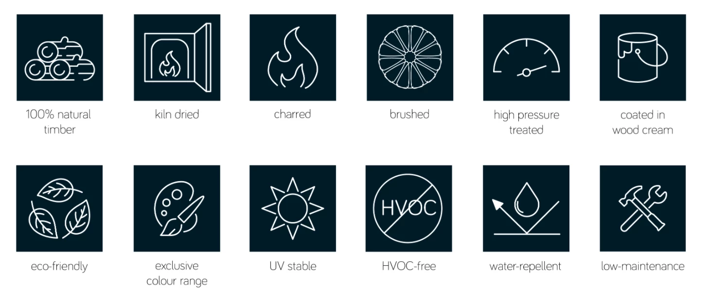 IRO external cladding is high quality yet affordable. Coated in wood cream to enhance the product’s charred profile, IRO cladding boasts a smooth, glossy and colourful finish that adds beauty and charm to any outdoor space. The coloured wood cream also adds water-repellent properties, meaning that liquids will pearl off the product and help to maintain it. 100% ecological – UV stable – 0% hazardous substances (HVOC free) – Manufactured in Britain – Pet-friendly – Self-cleaning water repellent surface/