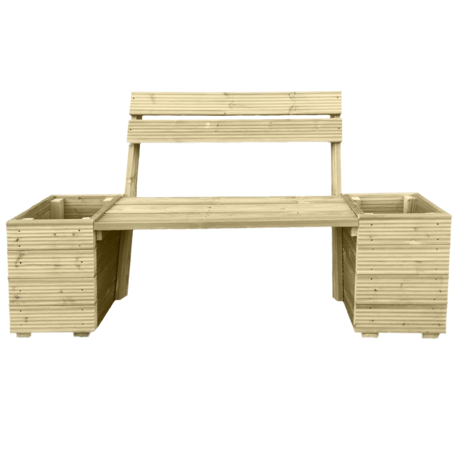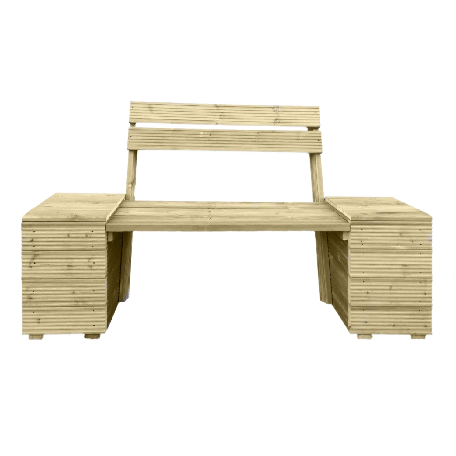 Handmade and one of our most uniquely designed planter. Comes with two decking planters either side and a decking resting and screwed in the middle. Optional back rest available as well. All made using pressure treated timber.Â